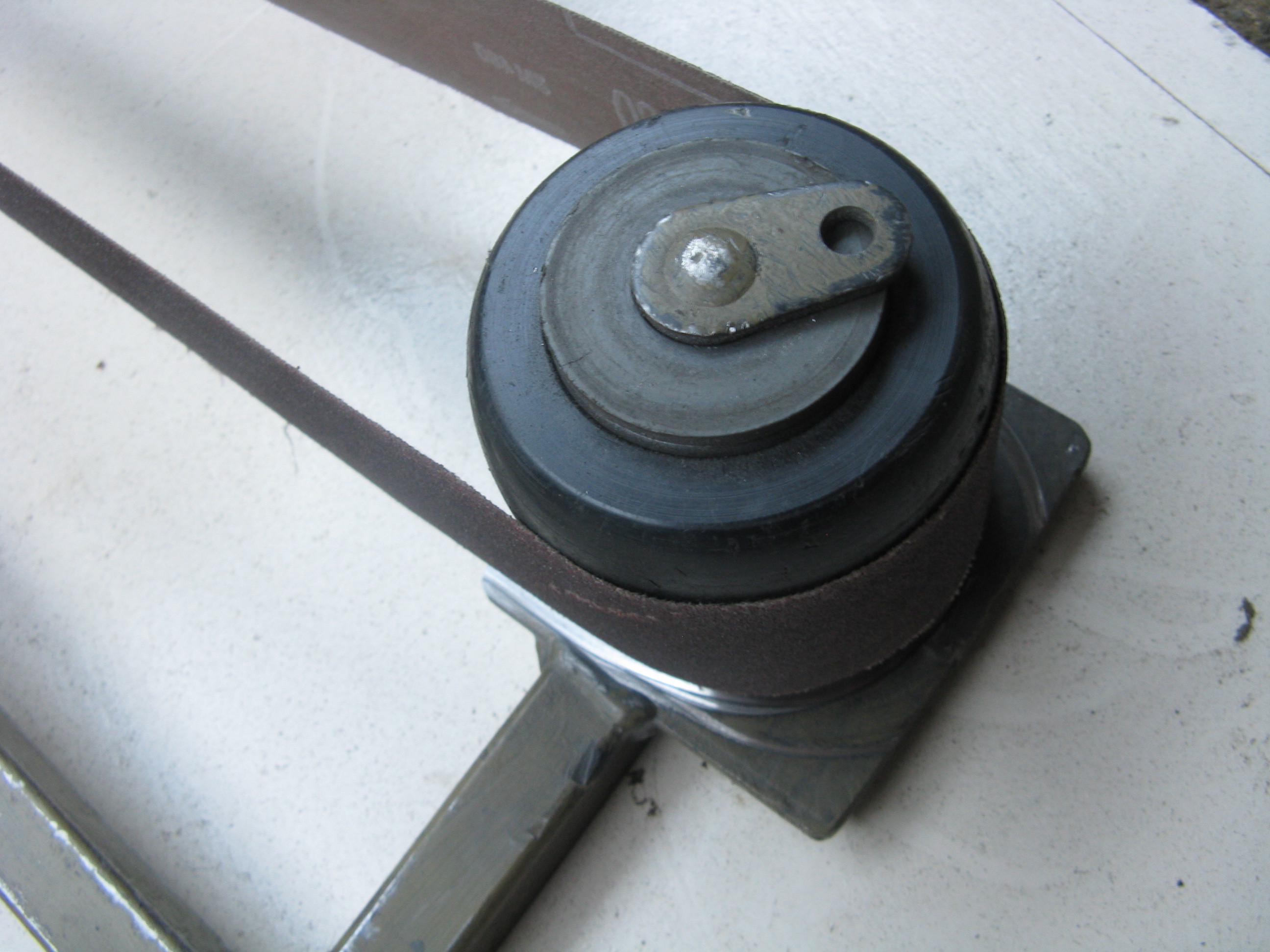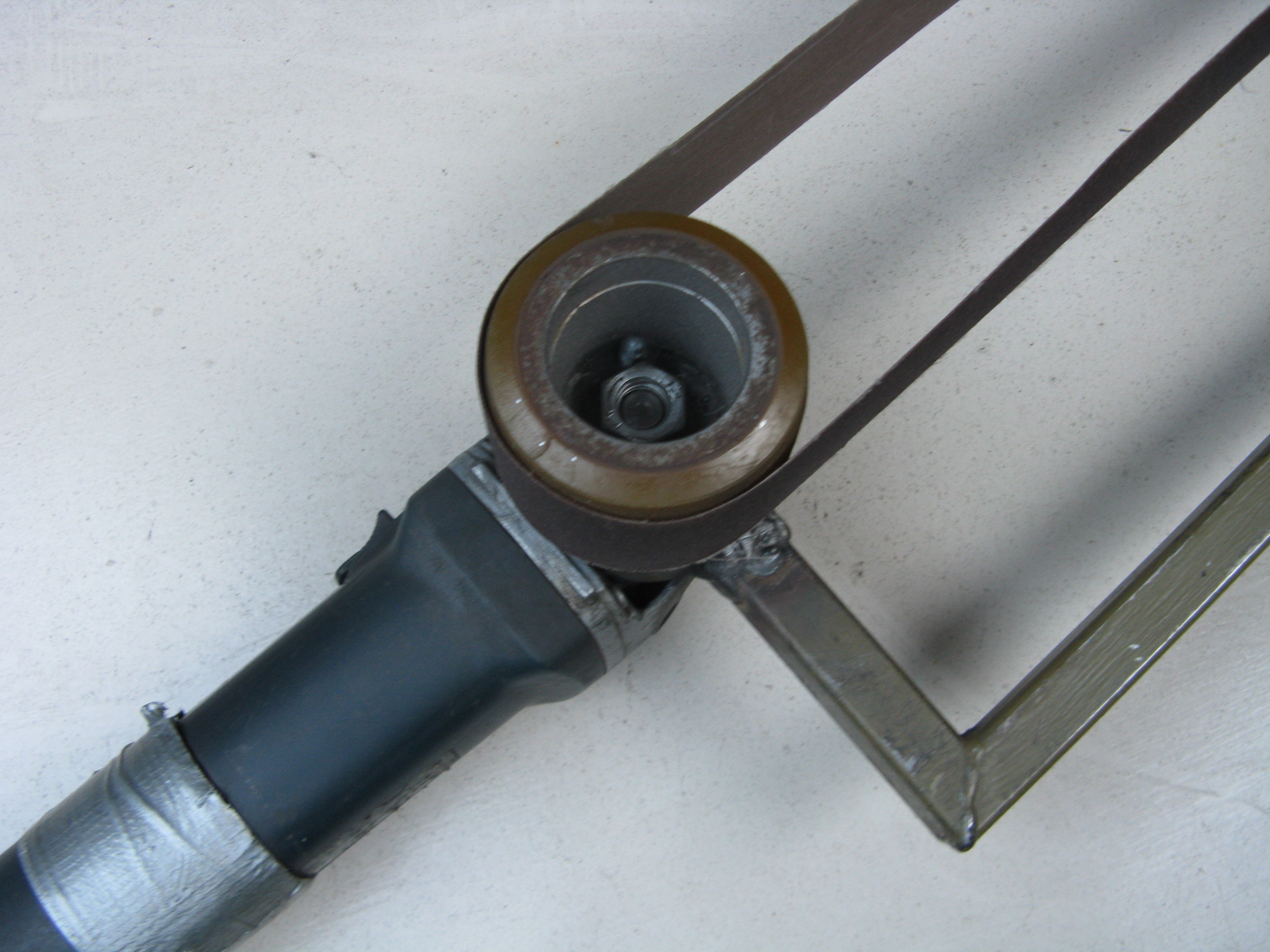 Een afgedankte haakse slijper, twee wieltjes van een palletwagen ,een frame met natuurlijk een stuk schuurlinnen waren voor Jelle voldoende om een eigen bandschuurmachine te bouwen. In plaats van een te lassen frame zou je ook een zaagbeugel kunnen nemen.