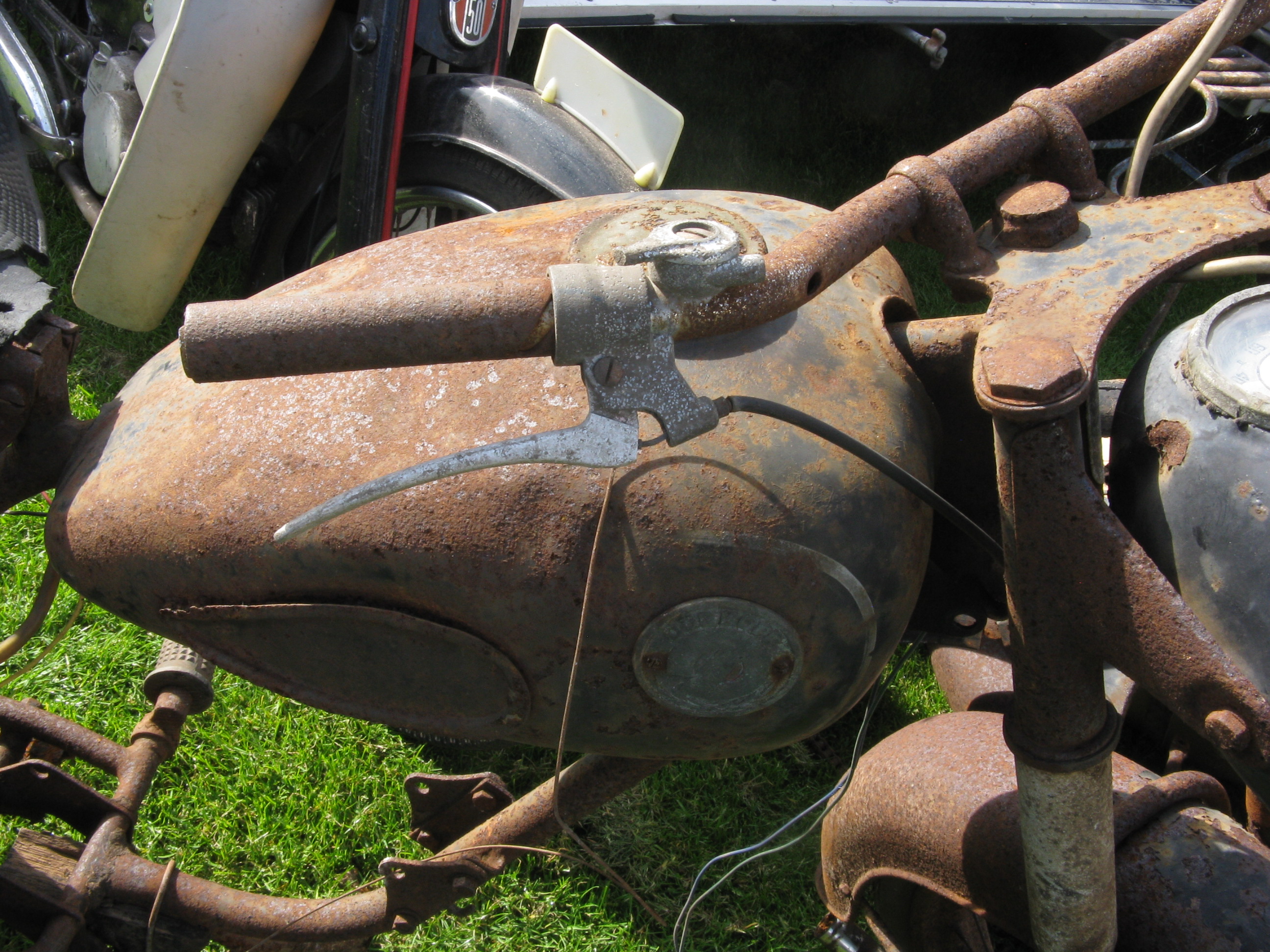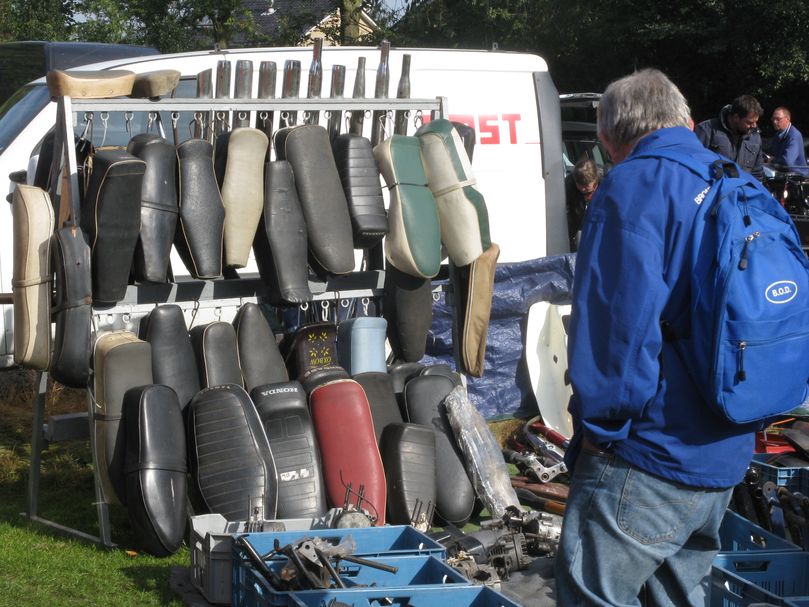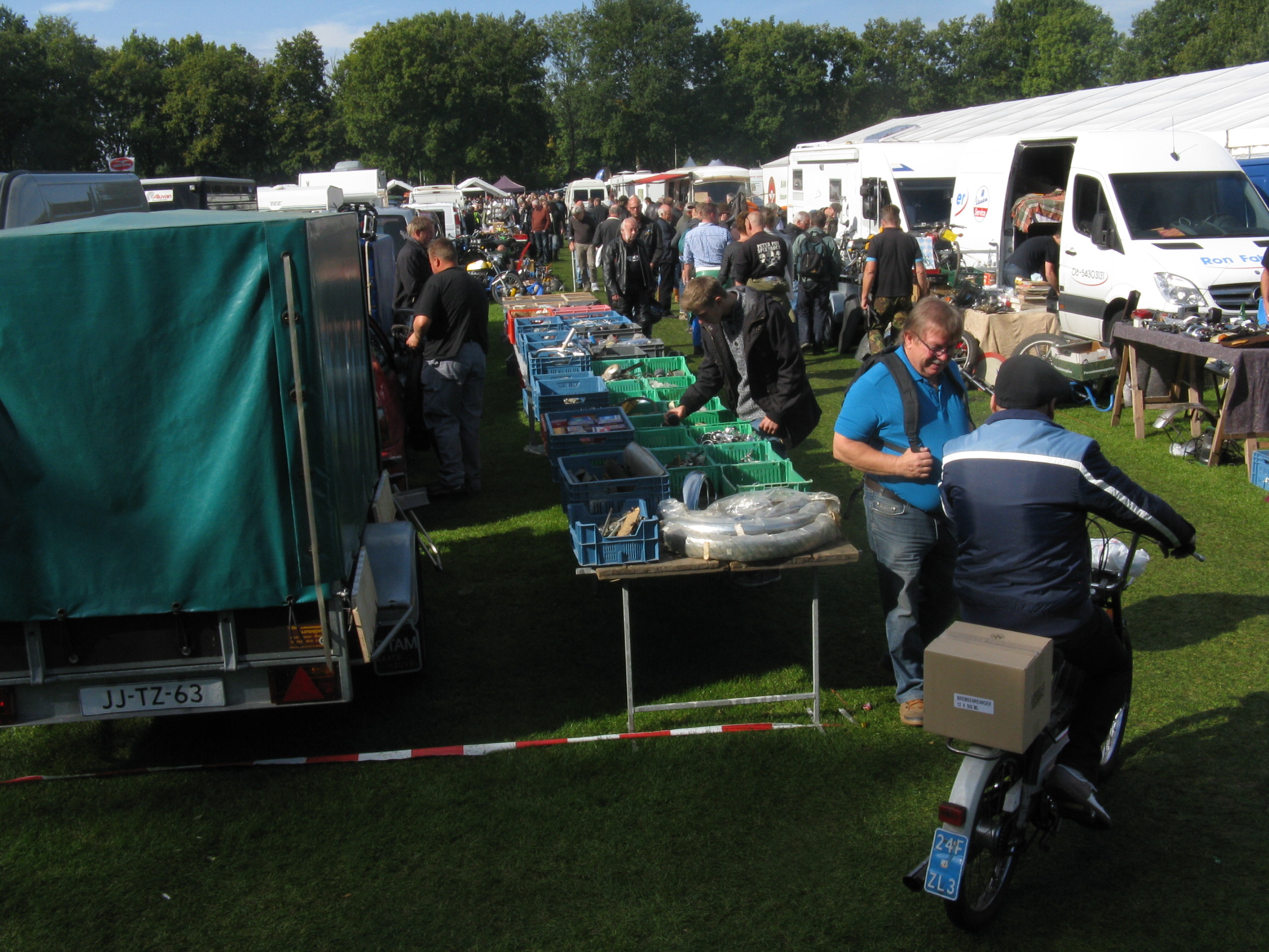 Stof en modder. Voor mij waren dat de bekendste ingrediënten van de Motormarkt in Hardenberg: stofwolken in de paardenhal en vette modder op het buitenterrein. Vandaag niet. Buiten: heerlijk slenterweer in de zon en een paar goeie aankopen zoals een draadvijl voor Whitworth-schroefdraad en tankbouten plus rubbers voor de Norton ES2-tank.